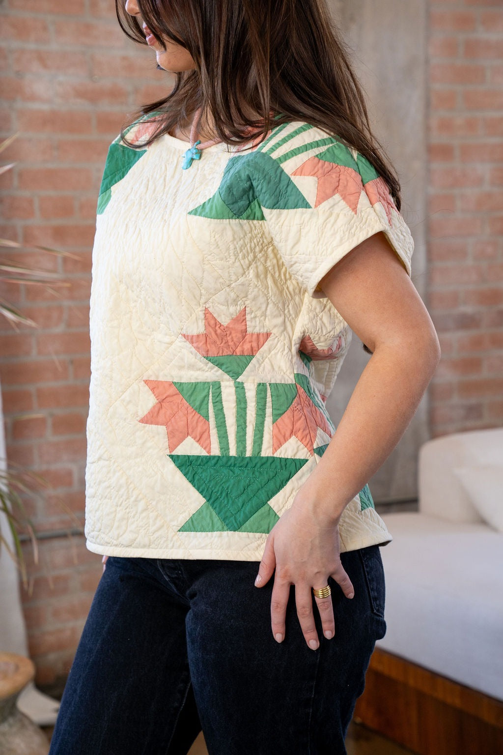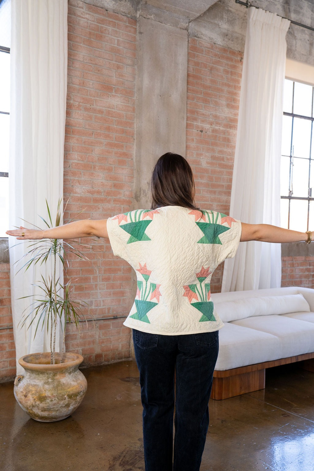 This quilted top showcases the intricate Carolina Lily pattern, with its graceful floral motifs lending a touch of tradition to a modern silhouette. The fitted peplum design accentuates the waist, creating a flattering shape that feels both tailored and feminine. Quilted texture adds depth and dimension, highlighting the craftsmanship of the piece. It’s a striking blend of heritage quilting and contemporary fashion.