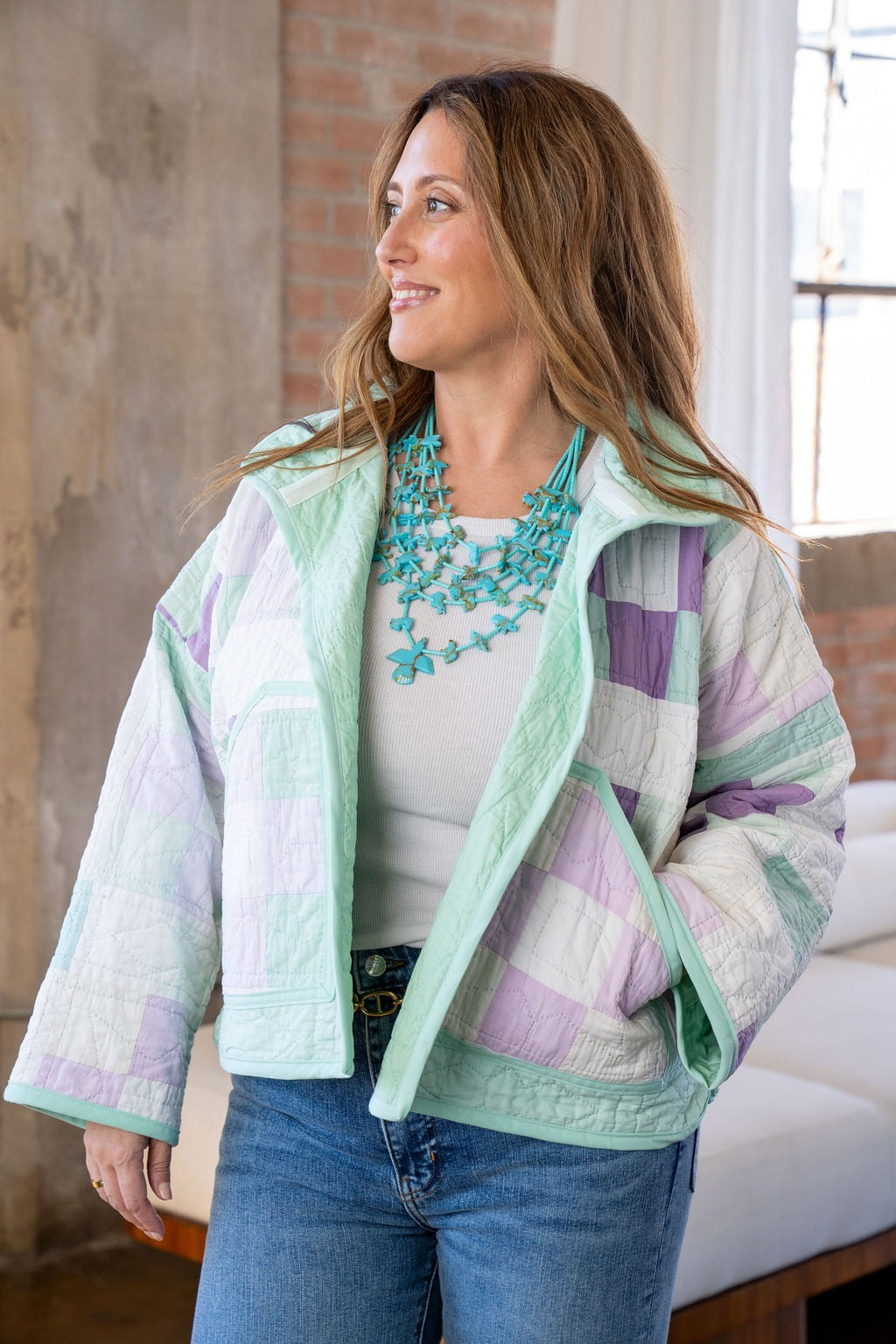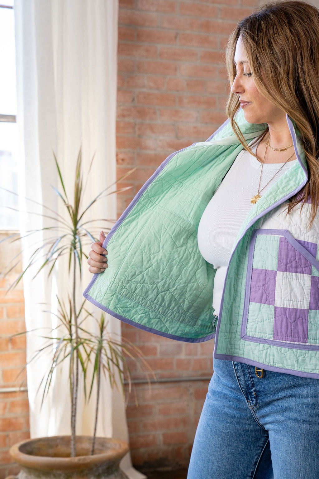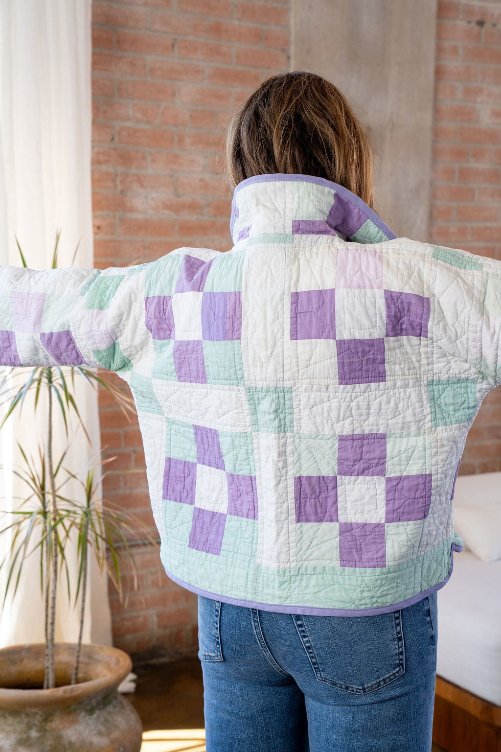 The Jane is an antique quilted jacket crafted in the timeless Nine Patch pattern, reimagined in fresh mint and purple hues. Its cropped, boxy fit gives it a modern edge while allowing the classic patchwork to take center stage. The bold color pairing highlights the geometric simplicity of the design, making it both playful and striking. A true blend of heritage and contemporary style, the Jane is effortlessly unique.